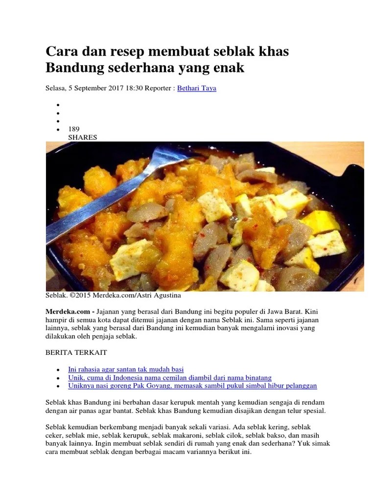 Sekarang makan ini cara membuat seblak kering tentu berbeda dari seblak basah. Itulah cara membuat seblak basah khas bandung. Seblak merupakan makanan khas dari kota bandung yang sangat unik. Panaskan minyak goreng dengan api sedang. Resep cara membuat seblak asli bandung, merupakan jajanan yang sangat populer di indonesia. Barangkali sudah banyak yang mengenal makanan khas dari kota bandung ini. Beberapa rekomendasi resep seblak yang enak khas daerah bandung dan cara membuatnya yang gampang banget. Tertarik ingin membuat seblak sendiri? Seblak khas bandung ini berbahan dasar kerupuk mentah yang kemudian sengaja di rendam dengan air panas agar bantat. Seblak khas bandung emang menjadi ciri khas yang wajib kalian ketahui bagaimana cara membuatnya, nah disini kami akan informasikan cara membuat : Cara membuat seblak basah sederhana khas bandung. Seblak basah pedas gurih siap disajikan dan santaplah selagi panas. Semoga informasi di atas bisa menjadi sumber referensi bermanfaat.
